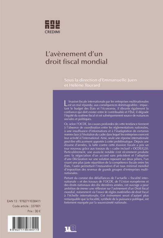 Partant du constat des défaillances de l'actuelle « fiscalité internationale » et des travaux de l'OCDE, de l'Union européenne et des droits nationaux des dix dernières années, cet ouvrage a pour ambition de démontrer l'avènement d'un Droit fiscal mondial, via l'essor de règles matérielles de droit fiscal à l'échelle internationale, évènement d'autant plus remarquable que la fiscalité, symbole de la puissance publique, est fortement marquée par la souveraineté nationale.