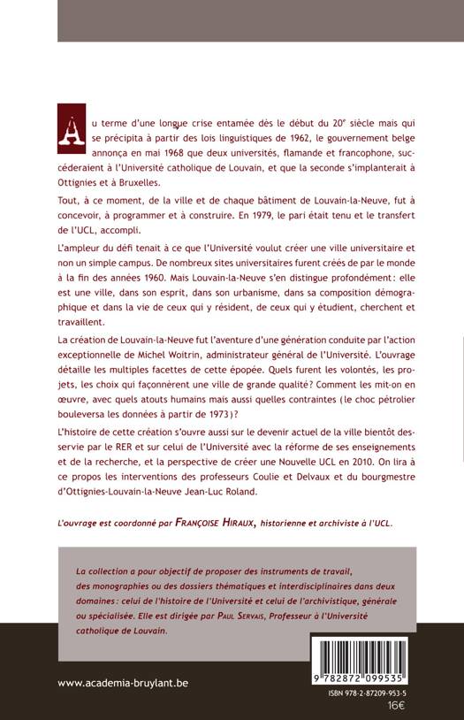 La création de Louvain-la-Neuve fut l'aventure d'une génération conduite par l'action exceptionnelle de Michel Woitrin, administrateur général de l'Université. L'ouvrage détaille les multiples facettes de cette épopée. Quels furent les volontés, les projets, les choix qui façonnèrent une ville de grande qualité? Comment les mit-on en oeuvre, avec quels atouts humains mais aussi quelles contraintes (le choc pétrolier bouleversa les données à partir de 1973)? L'histoire de cette création s'ouvre aussi sur le devenir actuel de la ville bientôt desservie par le RER et sur celui de l'Université avec la réforme de ses enseignements et de la recherche, et la perspective de créer une Nouvelle UCL en 2010.