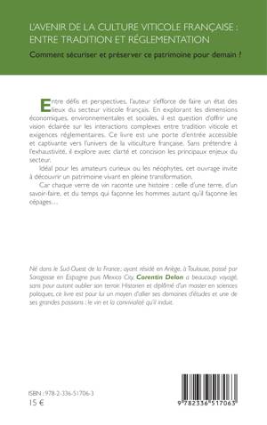 Entre défis et perspectives, l'auteur s'efforce de faire un état des lieux du secteur viticole français. En explorant les dimensions économiques, environnementales et sociales, il est question d'offrir une vision éclairée sur les interactions complexes entre tradition viticole et exigences réglementaires. Ce livre est une porte d'entrée accessible et captivante vers l'univers de la viticulture française. Sans prétendre à l'exhaustivité, il explore avec clarté et concision les principaux enjeux du secteur. Idéal pour les amateurs curieux ou les néophytes, cet ouvrage invite à découvrir un patrimoine vivant en pleine transformation. Car chaque verre de vin raconte une histoire celle d'une terre, d'un savoir-faire, et du temps qui façonne les hommes autant qu'il façonne les cépages...