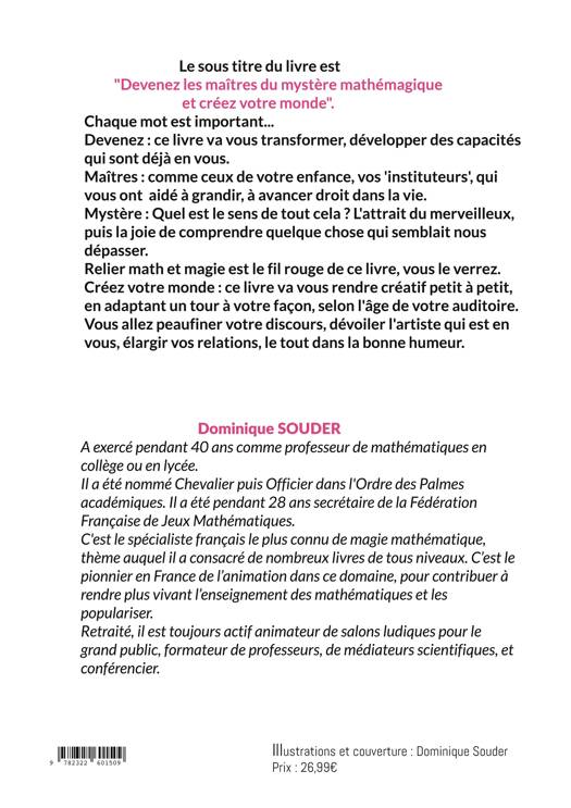 Le sous titre du livre est "Devenez les maîtres du mystère mathémagique et créez votre monde". Chaque mot est important. Devenez : ce livre va vous transformer, développer des capacités qui sont déjà en vous. Maîtres : comme ceux de votre enfance, vos 'instituteurs', qui vous ont aidé à grandir, à avancer droit dans la vie. Mystère : Quel est le sens de tout cela ? L'attrait du merveilleux, puis la joie de comprendre quelque chose qui semblait nous dépasser. Relier math et magie est le fil rouge de ce livre, vous le verrez. Créez votre monde : ce livre va vous rendre créatif petit à petit, en adaptant un tour à votre façon, selon l'âge de votre auditoire. Vous allez peaufiner votre discours, dévoiler l'artiste qui est en vous, élargir vos relations, le tout dans la bonne humeur.