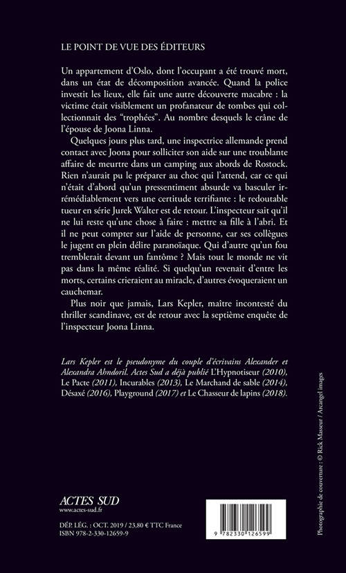 Quelques jours plus tard, une inspectrice allemande prend contact avec Joona pour solliciter son aide sur une troublante affaire de meurtre dans un camping aux abords de Rostock. Rien n'aurait pu le préparer au choc qui l'attend, car ce qui n'était d'abord qu'un pressentiment absurde va basculer irrémédiablement vers une certitude terrifiante : le redoutable tueur en série Jurek Walter est de retour. L'inspecteur sait qu'il ne lui reste qu'une chose à faire : mettre sa fille à l'abri. Et il ne peut compter sur l'aide de personne, car ses collègues le jugent en plein délire paranoïaque. Qui d'autre qu'un fou tremblerait devant un fantôme ? Mais tout le monde ne vit pas dans la même réalité. Si quelqu'un revenait d'entre les morts, certains crieraient au miracle, d'autres évoqueraient un cauchemar.
