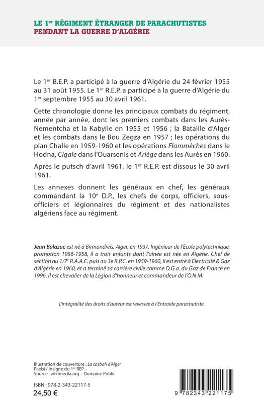 Le 1er B.E.P. a participé à la guerre d’Algérie du 24 février 1955 au 31 août 1955. Le 1er R.E.P. a participé à la guerre d’Algérie du 1er septembre 1955 au 30 avril 1961. Cette chronologie donne les principaux combats du régiment, année par année, dont les premiers combats dans les Aurès-Nementcha et la Kabylie en 1955 et 1956 ; la Bataille d’Alger et les combats dans le Bou Zegza en 1957 ; les opérations du plan Challe en 1959-1960 et les opérations Flammèches dans le Hodna, Cigale dans l’Ouarsenis et Ariège dans les Aurès en 1960. Après le putsch d’avril 1961, le 1er R.E.P. est dissous le 30 avril 1961.