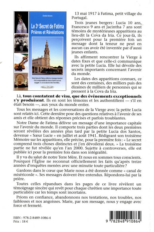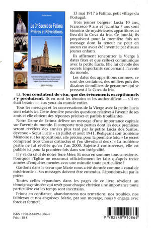 13 mai 1917 à Fatima, petit village du Portugal. Trois jeunes bergers : Lucia 10 ans, Francesco 9 ans et Jacintha 7 ans sont témoins de mystérieuses apparitions au lieu-dit la Cova da Iria. Ce jour-là, ils perçoivent pour la première fois un message dont la teneur ne peut en aucun cas avoir été inventée par d'aussi jeunes enfants. Ils affirment rencontrer la Vierge à dates fixes et que celle-ci communique avec la petite Lucia. Elle lui dévoile des secrets importants concernant l'avenir du monde. Les dates des apparitions connues, ce sont des centaines, des milliers puis des dizaines de milliers de personnes qui se pressent à la Cova da Iria. Là, tous constatent de visu, que des événements exceptionnels s'y produisent. Ils en sont les témoins et les authentifient - s'il en était besoin -, aux yeux du monde entier. Tous les messages et les conversations de la Vierge avec la petite Lucia sont relatés ici. Cette dernière pose des questions relatives à l'avenir de ses amis et elle obtient des réponses précises et parfois troublantes. Notre Dame de Fatima délivre un message d'une importance capitale sur l'avenir du monde.