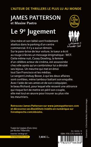 Une mère et son bébé sont froidement abattus dans le parking d'un centre commercial. Il n'y a aucun témoin. Sur le pare-brise de leur voiture, le tueur a écrit au rouge à lèvres un message énigmatique : WCF. Cette même nuit, Casey Dowling, la femme d’un célèbre acteur de cinéma, est assassinée chez elle après qu’un cambrioleur lui a dérobé ses bijoux. Un meurtre qui met en émoi tout San Francisco et les médias. Le sergent Lindsay Boxer, à qui les deux affaires sont confiées, mène tambour battant son enquête. Avec l'aide de ses amies et de son coéquipier, le beau Richard, pour lequel elle ressent une attirance qui risque fort de mettre en péril son couple, elle met tout en œuvre pour trouver au plus vite les meurtriers. Une neuvième enquête du Women Murder Club encore plus palpitante et terrifiante que les précédentes.