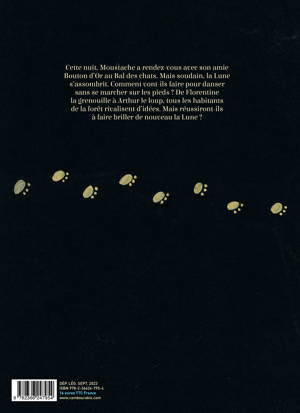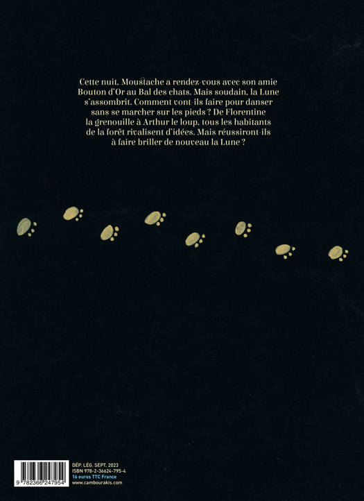 Cette nuit, Moustache a rendez-vous avec son amie Bouton d'Or au Bal des chats. Mais soudain, la Lune s'assombrit. Comment vont-ils faire pour danser sans se marcher sur les pieds ? De Florentine la grenouille à Arthur le loup, tous les habitants de la forêt rivalisent d'idées. Mais réussiront-ils à faire briller de nouveau la Lune ?