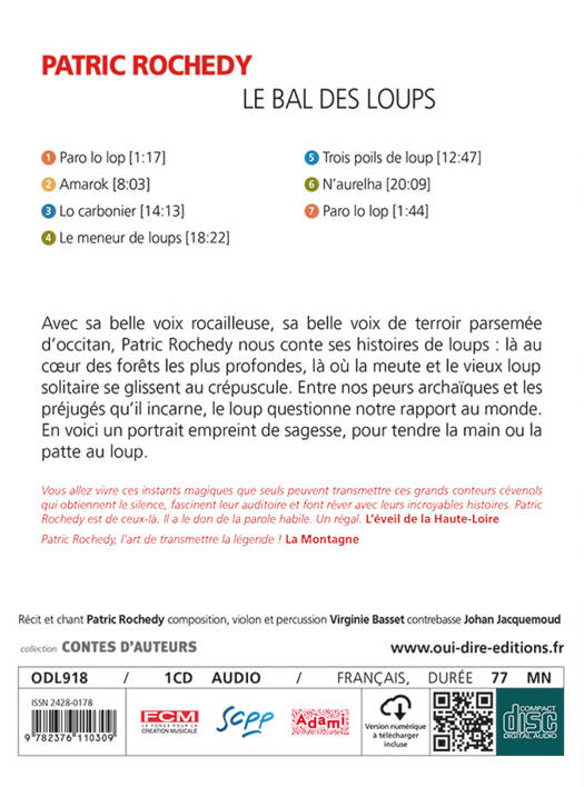Avec sa belle voix rocailleuse, sa belle voix de terroir parsemée d'occitan, Patric Rochedy nous conte ses histoires de loups : là au coeur des forêts les plus profondes, là où la meute et le vieux loup solitaire se glissent au crépuscule. Entre nos peurs archaïques et les préjugés qu'il incarne, le loup questionne notre rapport au monde. En voici un portrait empreint de sagesse, pour tendre la main ou la patte au loup.