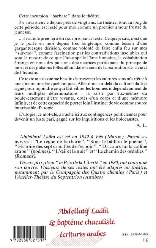 Cette incursion "barbare" dans le théâtre. J'en avais envie depuis près de vingt ans. Le théâtre, tout au long de 'cette période, est resté pour moi comme un premier amour frustré de Jeunesse . ... Je suis le premier à être surpris par ce texte. Ce que je sais, c'est que je le porte en moi depuis très longtemps, comme besoin d'une gargantuesque dérision, comme volonté de faire enfin feu sur mes "sur-moi", comme fascination par les contradictions insolubles qui sont le ressort de ce que l'on appelle l'âme humaine, la cohabitation étrange en nous des pulsions destructrices participant du principe de mort et des pulsions folles allant dans le sens de la réalisation de la vie et de l'humain.