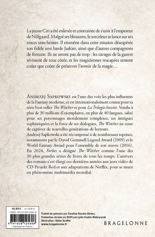 La jeune Ciri a été enlevée et contrainte de s'unir à l'empereur de Nilfgaard. Malgré ses blessures, le sorceleur se lance sur ses traces sans hésiter. Il emmène dans cette mission désespérée son fidèle ami barde Jaskier, ainsi que d'autres compagnons de fortune. Ils ne seront pas de trop : les ravages de la guerre sévissent de tous côtés, et les magiciennes rescapées tentent coûte que coûte de préserver l'avenir de la magie...