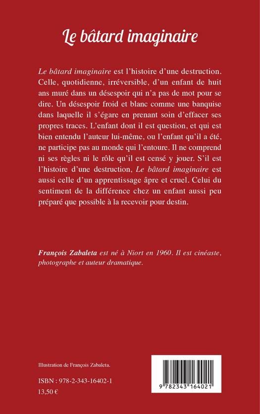 Le bâtard imaginaire est l’histoire d’une destruction. Celle, quotidienne, irréversible, d’un enfant de huit ans muré dans un désespoir qui n’a pas de mot pour se dire. Un désespoir froid et blanc comme une banquise dans laquelle il s’égare en prenant soin d’effacer ses propres traces. Il ne comprend, ni ces règles ni le rôle qu’il est censé y jouer. Cet ouvrage est aussi celle d’un apprentissage âpre et cruel. Celui du sentiment de la différence chez un enfant aussi peu préparé que possible à la recevoir pour destin.