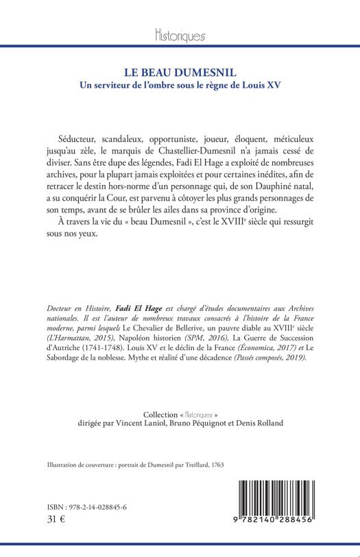 Séducteur, scandaleux, opportuniste, joueur, éloquent, méticuleux jusqu'au zèle, le marquis de Chastellier-Dumesnil n'a jamais cessé de diviser. Sans être dupe des légendes, Fadi El Hage a exploité de nombreuses archives, pour la plupart jamais exploitées et pour certaines inédites, afin de retracer le destin hors-norme d'un personnage qui, de son Dauphiné natal, a su conquérir la Cour, est parvenu à côtoyer les plus grands personnages de son temps, avant de se brûler les ailes dans sa province d'origine. À travers la vie du « beau Dumesnil », c'est le XVIIIe siècle qui ressurgit sous nos yeux.