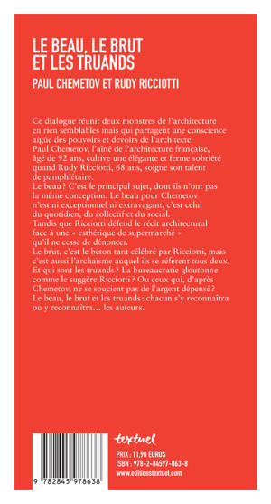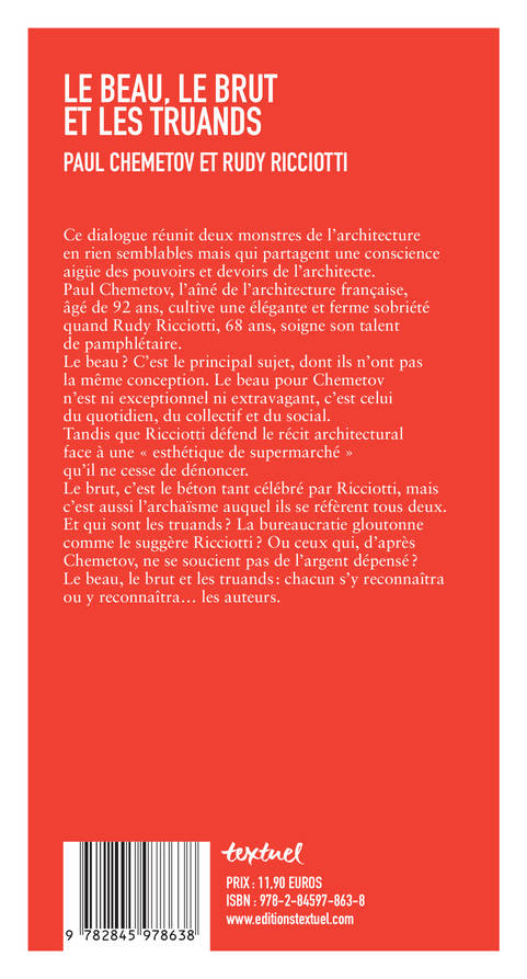 Dans ce magnifique dialogue entre deux monstres de l'architecture française, Paul Chemetov, l'ainé, et Rudy Ricciotti, le fougueux, évoquent avec humour et autodérision des thèmes cruciaux pour la profession comme la modernité et l'archaïsme ou la commande publique. Un échange affuté à mettre dans les mains de tout architecte ou aspirant architecte!