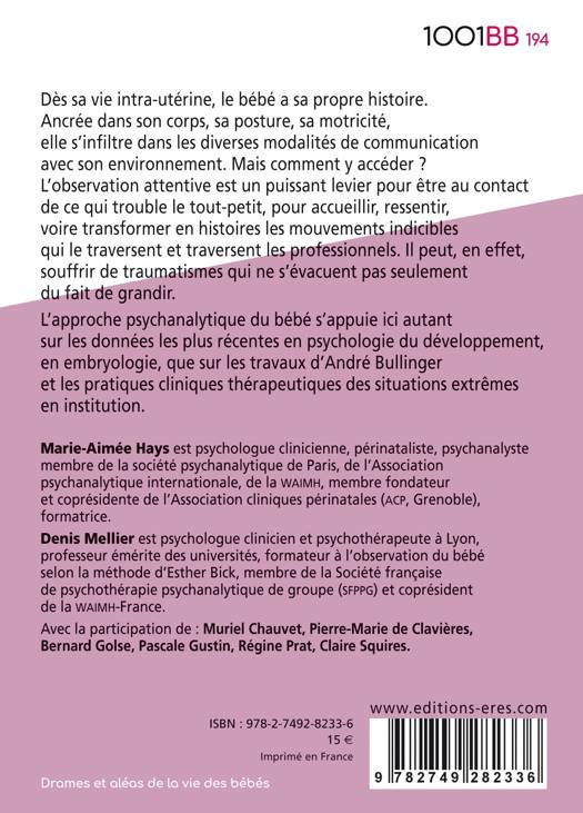Dès sa vie intra-utérine, le bébé a sa propre histoire. Ancrée dans son corps, sa posture, sa motricité, elle s'infiltre dans les diverses modalités de communication avec son environnement. Mais comment y accéder ? L'observation attentive est un puissant levier pour être au contact de ce qui trouble le tout-petit, pour accueillir, ressentir, voire transformer en histoires les mouvements indicibles qui le traversent et traversent les professionnels. Il peut, en effet, souffrir de traumatismes qui ne s'évacuent pas seulement du fait de grandir.