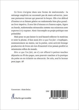 Ce livre s’origine dans une forme de malentendu : la mésange empêtrée ne reconnaît pas de main salvatrice, juste une puissance intruse qui pourrait la broyer. Elle s’en défend d’instinct et ce faisant génère un malentendu bien plus grand : un livre imprévu. Il sera fait d’oiseaux et d’autres sujets, légers ou lourds, malentendus minuscules comme nos existences sont expertes à s’y exposer. Ainsi s’accomplit un projet poétique non prémédité. Mais pour ne pas laisser le seul hasard collecter le matériau et tenir la plume, il faut aussi dire ce que l’on fait : s’expliquer, sommairement au moins, sur la poésie, cette activité étrange productrice de livres où rien d’essentiel n’est jamais proféré et néanmoins reflets du monde. Dire ce que l’on fait, on s’y est efforcé à petites touches déposées au fil des pages, sans pouvoir conclure si la pratique du poète en est éclairée ou obscurcie. De cela, seul le lecteur peut juger.