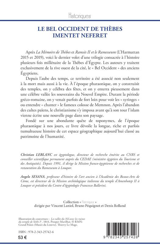 Après La Mémoire de Thèbes et Ramsès II et le Ramesseum (L’Harmattan 2015 et 2019), voici le dernier volet d’une trilogie consacrée à l’histoire plusieurs fois millénaire de la Thèbes d’Égypte. Les auteurs y traitent exclusivement de la rive ouest de la cité, le « Bel Occident » des anciens Égyptiens. Depuis l’aube des temps, ce territoire a été associé non seulement à la mort mais aussi à la vie. À l’époque pharaonique, on y construisit des temples, on y célébra des fêtes, et on y enterra pieusement dans une célèbre vallée les souverains du Nouvel Empire. Durant la période gréco-romaine, on y venait parfois de fort loin pour voir les « syringes » ou entendre « chanter » le fameux colosse de Memnon. Après l’abandon des cultes païens, le christianisme s’y imposa avant qu’à son tour l’islam vienne écrire une nouvelle page dans son paysage. Fondé sur une abondante quête de toponymes, de l’époque pharaonique à nos jours, ce livre dévoile la longue, riche et parfois tumultueuse histoire de cet espace géographique aujourd’hui classé au patrimoine de l’humanité.