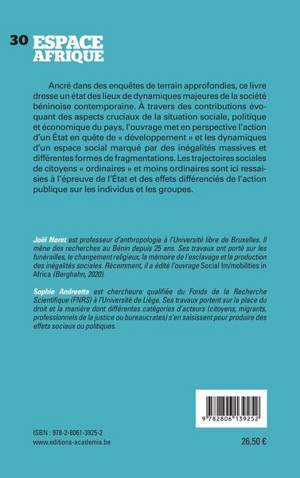 Ancré dans des enquêtes de terrain approfondies, ce livre dresse un état des lieux de dynamiques majeures de la société béninoise contemporaine. À travers des contributions évoquant des aspects cruciaux de la situation sociale, politique et économique du pays, l'ouvrage met en perspective l'action d'un État en quête de développement et les dynamiques d'un espace social marqué par des inégalités massives et différentes formes de fragmentations. Les trajectoires sociales de citoyens ordinaires et moins ordinaires sont ici ressaisies à l'épreuve de l'État, et des effets différenciés de l'action publique sur les individus et les groupes.