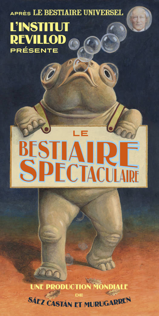 Le célèbre Professeur Revillod, scientifique universellement réputé, est de retour ! Chers spectateurs, prenez place pour assister à la plus fabuleuse des représentations de la nature... Bienvenue dans le Bestiaire spectaculaire ! Après le succès du Bestiaire Universel du Professeur Revillod, Miguel Murugarren et Javier Sáez Castán nous plongent dans le royaume étrange et extravagant de la scène et du divertissement. Par un astucieux système de languettes mobiles, les créatures se mêlent et se transforment pour donner naissance à des Éléchottoes, Moroutique, Siphodomone, et autres incroyables chimères. Ce fabuleux almanach de la faune imaginaire enchantera petits et grands.