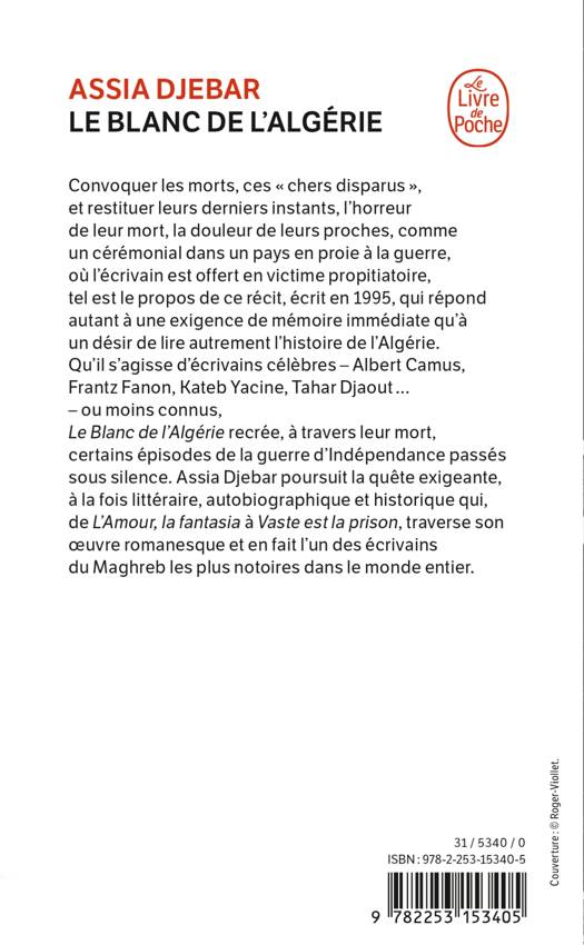 Convoquer les morts, ces « chers disparus », et restituer leurs derniers instants, l’horreur de leur mort, la douleur de leurs proches, comme un cérémonial dans un pays en proie à la guerre, où l’écrivain est offert en victime propitiatoire, tel est le propos de ce récit qui répond autant à une exigence de mémoire immédiate qu’à un désir de lire autrement l’histoire de l’Algérie. Qu’il s’agisse d’écrivains célèbres – Albert Camus, Jean Amrouche, Frantz Fanon, Jean Sénac, Mouloud Mammeri, Kateb Yacine, Tahar Djaout – ou moins connus, Le Blanc de l’Algérie recrée, à travers leur mort, certains épisodes de la guerre d’Indépendance passés sous silence, éclairant ainsi l’amont de la crise actuelle comme guerre fratricide. Avec ce récit tour à tour élégiaque et dépouillé, Assia Djebar poursuit la quête exigeante, à la fois littéraire, autobiographique et historique qui, de L’Amour, la fantasia àVaste est la prison, traverse son œuvre romanesque et en fait l’un des écrivains du Maghreb les plus connus dans le monde entier.