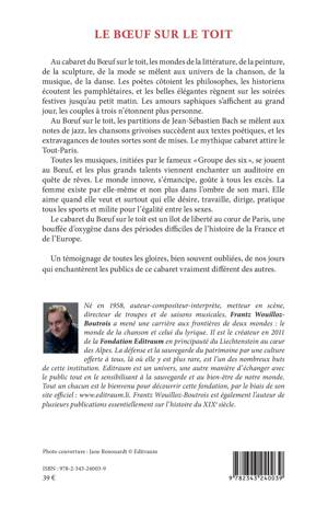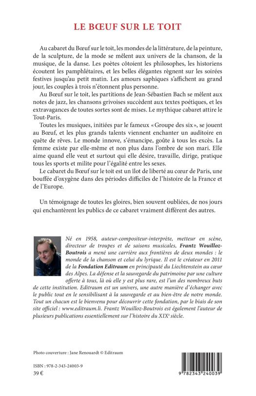 Au cabaret du Boeuf sur le toit, les mondes de la littérature, de la peinture, de la sculpture, de la mode se mêlent aux univers de la chanson, de la musique, de la danse. Le mythique cabaret attire le Tout-Paris. Toutes les musiques, initiées par le fameux « Groupe des six », se jouent au Boeuf, et les plus grands talents viennent enchanter un auditoire en quête de rêves. C'est un îlot de liberté au coeur de Paris, une bouffée d'oxygène dans des périodes difficiles de l'histoire de la France et de l'Europe. Un témoignage de toutes les gloires, bien souvent oubliées, de nos jours qui enchantèrent les publics de ce cabaret vraiment différent des autres.