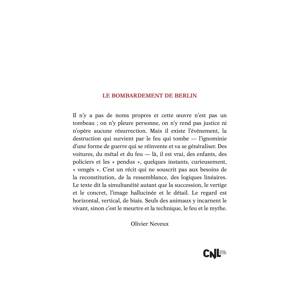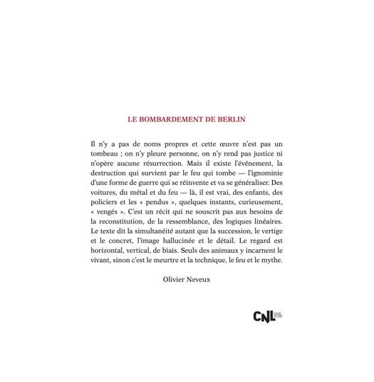 Il n'y a pas de noms propres et cette oeuvre n'est pas un tombeau ; on n'y pleure personne, on n'y rend pas justice ni n'opère aucune résurrection. Mais il existe l'événement, la destruction qui survient par le feu qui tombe - l'ignominie d'une forme de guerre qui se réinvente et va se généraliser. Des voitures, du métal et du feu - là, il est vrai, des enfants, des policiers et les « pendus », quelques instants, curieusement, « vengés ». C'est un récit qui ne souscrit pas aux besoins de la reconstitution, de la ressemblance, des logiques linéaires. Le texte dit la simultanéité autant que la succession, le vertige et le concret, l'image hallucinée et le détail. Le regard est horizontal, vertical, de biais. Seuls des animaux y incarnent le vivant, sinon c'est le meurtre et la technique, le feu et le mythe.