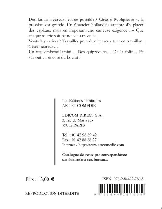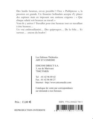 Des lundis heureux, est-ce possible ? Chez Publipresse, la pression est grande. Un financier hollandais accepte d'y placer des capitaux mais en imposant une curieuse exigence: Que chaque salarié soit heureux au travail. Vont-ils y arriver ? Travailler pour être heureux tout en travaillant à être heureux... Un vrai embrouillamini... Des quiproquos... De la folie... Et surtout... encore du boulot !