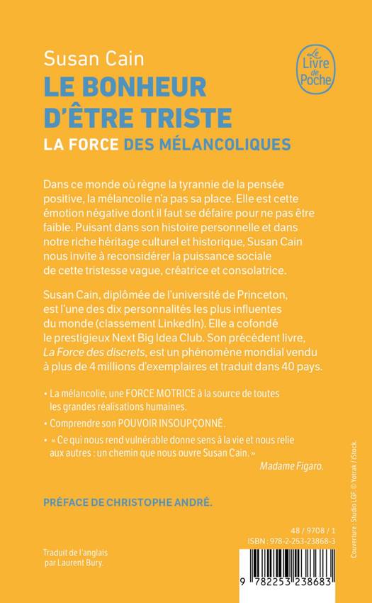 Dans ce monde où règne la tyrannie de la pensée positive, la mélancolie n'a pas sa place. Elle est cette émotion négative dont il faut se défaire pour ne pas être faible. Puisant dans son histoire personnelle et dans notre riche héritage culturel et historique, Susan Cain nous invite à reconsidérer sa puissance sociale, créatrice et consolatrice. Susan Cain, diplômée de l'université de Princeton, est l'une des dix personnalités les plus influentes du monde (classement LinkedIn). Elle a cofondé le prestigieux Next Big ldea Club. Son précédent livre, La Force des discrets, est un phénomène mondial vendu à plus de 4 millions d'exemplaires et traduit dans 40 pays.