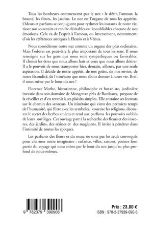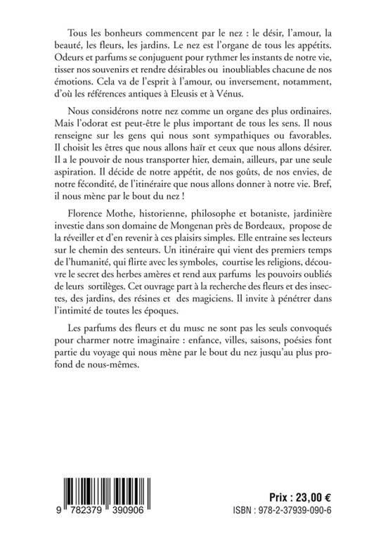 De tous nos sens, l’olfaction est peut-être le plus méprisé. Nous considérons notre nez comme un organe des plus ordinaires, sans doute parce qu’il ne peut se cacher au milieu de notre figure. Mais le paradoxe est que l’odorat dissimule son jeu. Il est sans doute le plus important de tous les sens. Il nous renseigne sur les gens qui nous sont sympathiques ou favorables. Il choisit les êtres que nous allons haïr et ceux que nous allons désirer. Il a le pouvoir de nous transporter hier, demain, ailleurs, par une seule aspiration. Il décide de notre appétit, de nos goûts, de nos envies, de notre fécondité, de l’itinéraire que nous allons donner à notre vie. Bref, il nous mène par le bout du nez ! Jadis, on reconnaissait au nez la plus grande importance. On utilisait les parfums pour séduire, pour prier, pour obtenir par sortilège, pour se protéger de la peste. On ne pouvait se passer d’eux tant les odeurs fortes faisaient partie de la vie, jusqu’à l’empoisonner. L’homme et la femme avaient du flair, comme les animaux . Ils ont perdu peu à peu l’usage du nez, cet organe merveilleux confisqué par la dictature de l’hygiène, l’usage des produits d’entretien et de l’eau de Javel qui nous font oublier cette sensibilité première qui nous conférait tant de pouvoirs. Ce livre propose à ses lecteurs de les retrouver au fond d’eux-mêmes. Il part à la recherche des fleurs et des insectes, des jardins, des résines et des magiciens. Il invite à pénétrer dans l’intimité de toutes les époques, à retrouver les moeurs du passé, à s’introduire dans les alcôves et les palais pour en percer les secrets. Il se lance à la recherche des parfums perdus et à la rencontre des parfums d’hier et d'aujourd’hui, de ville en ville, de port en port, de quartier en quartier, de saison en saison, d’heure en heure et nous introduit dans le labyrinthe obscur de leurs subtiles correspondances. Il rappelle comment les poètes ont vanté les parfums et comment les fleurs nous les ont offert en aidant à la diversification des espèces et à la multiplication des variétés par abeilles interposées. Il démontre surtout que le plaisir, le désir, l’amour ne seraient pas sans les fragrances qui les subliment, des je-ne-sais-quoi, des presque rien sans qui la vie ne serait plus la même tant l’odeur est la marque profonde de nous-mêmes. Philosophe et historienne, Florence Mothe est aussi jardinière et ne se lasse pas de retrouver à travers les parcours des senteurs, des saveurs et des couleurs de son jardin de Mongenan tous les bonheurs du 18e siècle.