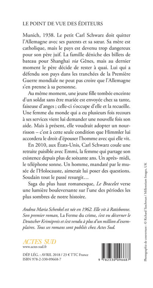 Munich, 1938. Le petit Carl Schwarz doit quitter l'Allemagne avec ses parents et sa soeur. Sa mère est catholique, mais le pays est devenu trop dangereux pour son père juif. La famille déniche des billets de bateau pour Shanghai via Gênes, mais au dernier moment le père décide de rester à quai. Lui qui a défendu son pays dans les tranchées de la Première Guerre mondiale ne peut pas croire que l'Allemagne s'en prenne à sa personne. Au même moment, une jeune fille tombée enceinte d'un soldat sans être mariée est envoyée chez sa tante, faiseuse d'anges ; celle-ci s'occupe d'elle et la recueille. Une femme du monde qui a eu plusieurs fois recours à ses services vient lui demander une nouvelle fois son aide. Mais à présent, elle voudrait adopter un nourrisson - c'est à cette seule condition que Himmler lui accordera le droit d'épouser l'homme avec qui elle vit. En 2010, aux États-Unis, Carl Schwarz coule une retraite paisible avec Emmi, la femme qui partage son existence depuis plus de soixante ans. Un après- midi, le téléphone sonne. Un homme, mandaté par le musée de l'Holocauste, aimerait lui poser des questions. Soudain tout le passé resurgit... Saga du plus haut romanesque, Le Bracelet verse une lumière bouleversante sur l'une des périodes les plus sombres de notre histoire .