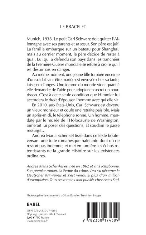 Munich, 1938. Le petit Carl Schwarz doit quitter l'Allemagne avec ses parents et sa soeur. Son père est juif. La famille embarque sur un bateau pour Shanghai, mais au dernier moment, le père décide de rester à quai. Lui qui a défendu son pays dans les tranchées de la Première Guerre mondiale se refuse à croire qu'il est désormais en danger. Au même moment, une jeune fille tombée enceinte d'un soldat sans être mariée est envoyée chez sa tante, faiseuse d'anges. Une femme du monde vient quant à elle demander de l'aide pour adopter en secret un nourrisson. C'est à cette seule condition que Himmler lui accordera le droit d'épouser l'homme avec qui elle vit. En 2010, aux États-Unis, Carl Schwarz est devenu un vieux monsieur et coule une retraite paisible. Mais un après-midi, le téléphone sonne. Un homme, mandaté par le musée de l'Holocauste de Washington, aimerait lui poser des questions. Et soudain le passé ressurgit... Andrea Maria Schenkel tisse dans ce texte bouleversant une toile romanesque haletante dont on ne ressort pas indemne, et met en lumière les échos retentissants de la grande Histoire sur les existences ordinaires.