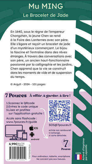 Un livre numérique matérialisé par une jolie carte, à lire sur une application stimulante ! En 1640, sous le règne de l'empereur Chongzhen, la jeune Chen se rend à la Foire des Lanternes avec son père. Elle s'égare et reçoit un bracelet de jade d'un mystérieux commerçant. Le bijou la fascine et l'entraîne dans des rêves étranges. À travers des conversations avec son père, un ancien haut-fonctionnaire passionné par la calligraphie et les jardins, Chen apprend que la vie se construit dans les moments de vide et de suspension du temps.