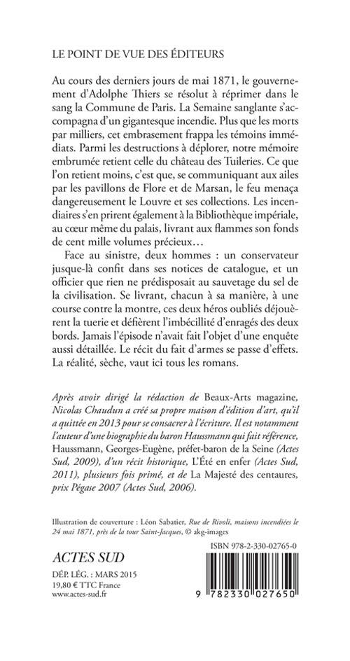 Au cours des derniers jours de mai 1871, le gouvernement d'Adolphe Thiers se résolut à réprimer dans le sang la Commune de Paris. La Semaine sanglante s'accompagna d'un gigantesque incendie. Plus que les morts par milliers, cet embrasement frappa les témoins immédiats. Parmi les destructions à déplorer, notre mémoire embrumée retient celle du château des Tuileries. Ce que l'on retient moins, c'est que, se communiquant aux ailes par les pavillons de Flore et de Marsan, le feu menaça dangereusement le Louvre et ses collections. Les incendiaires s'en prirent également à la Bibliothèque impériale, au coeur même du palais, livrant aux flammes son fonds de cent mille volumes précieux...