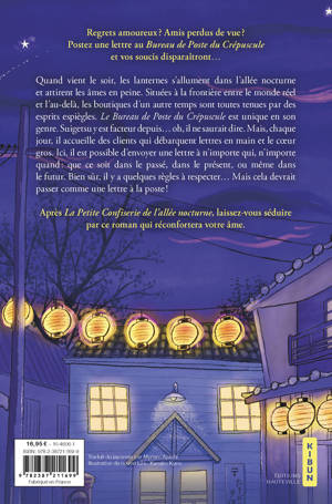 Quand vient le soir, les lanternes s'allument dans l'allée nocturne et attirent les âmes en peine. Situées à la frontière entre le monde réel et l'au-delà, les boutiques d'un autre temps sont toutes tenues par des esprits espiègles. La Poste du Crépuscule est unique en son genre. Suigetsu y est facteur depuis... oh, il ne saurait dire. Mais chaque jour, il accueille des clients qui débarquent lettres en main et le coeur gros. Ici, il est possible d'envoyer une lettre à n'importe qui, n'importe quand : que ce soit dans le passé, dans le présent, ou même dans le futur. Bien sûr, il y a quelques règles à respecter... Mais cela devrait passer comme une lettre à la poste !