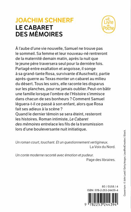 À l’aube d’une vie nouvelle, Samuel ne trouve pas le sommeil. Sa femme et leur nouveau-né rentreront de la maternité demain matin, après cette nuit que le jeune père traversera seul pour la dernière fois. Partagé entre exaltation et angoisse, il songe à sa grand-tante Rosa, survivante d’Auschwitz, partie après-guerre au Texas monter un cabaret au milieu du désert. Tous les soirs, elle raconte les disparus sur les planches, pour ne jamais oublier. Peut-on bâtir une famille lorsque l’ombre de l’Histoire s’immisce dans chacun de ses bonheurs ? Comment Samuel léguera-t-il ce passé à son enfant, alors que Rosa fait ses adieux à la scène ? Quand le dernier témoin se sera éteint, resteront les histoires. Roman intimiste, Le Cabaret des mémoires entrelace les fils de la transmission lors d’une bouleversante nuit initiatique.