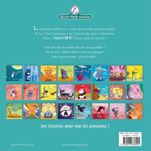Le cacatoès coiffeur en a assez de travailler pour les autres. Et lui ? Qui s'intéresse à lui ? Qui lui dit merci ? Personne. Alors... Couic-COUIC ! Tiens, voilà du boudin ! Vous êtes sûrs de vouloir aller chez le cacacoiffeur ? Pas de souci, Mamie Poule va vous accompagner. Mais soyez prévenus : ça va décoiffer !