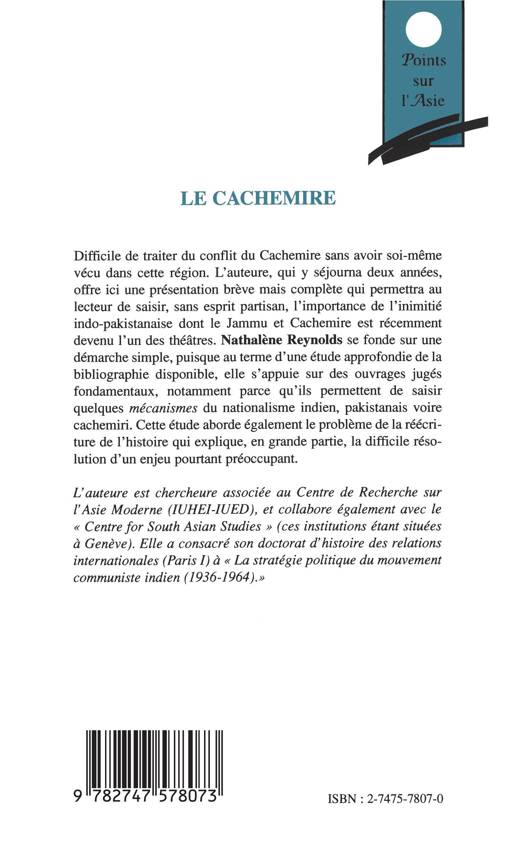 Difficile de traiter du conflit du Cachemire sans avoir soi-même vécu dans cette région. L'auteure, qui y séjourna deux années, offre ici une présentation brève mais complète qui permettra au lecteur de saisir, sans esprit partisan, l'importance de l'inimité indo-pakistanaise dont le Jammu et Cachemire est récemment devenu l'un des théâtres. Nathalène Reynolds elle s'appuie sur des ouvrages jugés fondamentaux, notamment parce qu'ils permettent de saisir quelques mécanismes du nationalisme indien, pakistanais et cachemiri.