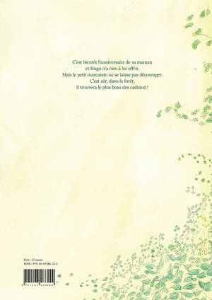C'est bientôt l'anniversaire de sa maman et Hugo n'a rien à lui offrir... Ses frères se moquent de lui. Heureusement, le gentil marcassin n'est pas du genre à se laisser décourager et s'élance dans la forêt à la recherche du plus beau des cadeaux. Il rencontre successivement musaraignes, lézards et écureuils qui lui font découvrir leurs trésors. Mais tous les goûts sont dans la nature et Hugo ne voit pas bien ce que sa maman en ferait. Va-t-il renoncer ?