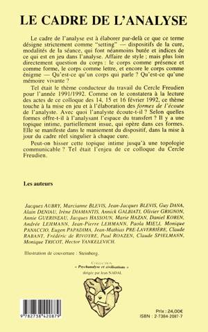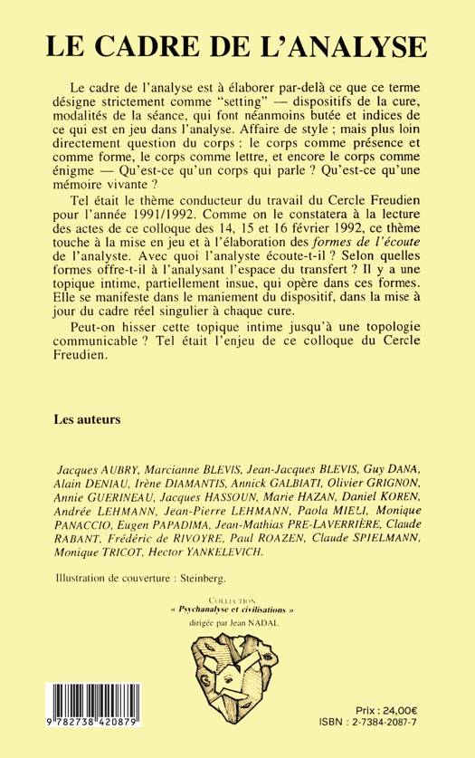 Le cadre de l'analyse est à élaborer par-delà ce que ce terme désigne strictement comme "setting"— dispositifs de la cure, modalités de la séance, qui font néanmoins butée et indices de ce qui est en jeu dans l'analyse. Affaire de style ; mais plus loin directement question du corps : le corps comme présence et comme forme, le corps comme lettre, et encore le corps comme énigme — Qu'est-ce qu'un corps qui parle ? Qu'est-ce qu'une mémoire vivante ? Tel était le thème conducteur du travail du Cercle Freudien pour l'année 1991/1992. Comme on le constatera à la lecture des actes de ce colloque des 14, 15 et 16 février 1992, ce thème touche à la mise en jeu et à l'élaboration des formes de l'écoute de l'analyste. Avec quoi l'analyste écoute-t-il ? Selon quelles formes offre-t-il à l'analysant l'espace du transfert ? Il y a une topique intime, particulièrement insue, qui opère dans ces formes. Elle se manifeste dans le maniement du dispositif, dans la mise à jour du cadre réel singulier à chaque cure. Peut-on hisser cette topique intime jusqu'à une topologie communicable ? Tel était l'enjeu de ce colloque du Cercle Freudien.