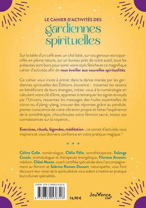 Ce cahier vous invite à entrer dans la danse menée par les gardiennes spirituelles des Éditions Jouvence : traversez les saisons en bénéficiant de leurs énergies, initiez-vous à la numérologie en calculant votre clé d’âme, apprenez à remarquer les signes envoyés par l’Univers, ressentez les messages des huiles essentielles de citron ou d’ylang-ylang, trouvez des réponses grâce au pendule, prenez conscience de votre vibration propre et faites l’expérience de la sonothérapie, chouchoutez votre féminin sacré, testez vos connaissances sur la voyance…