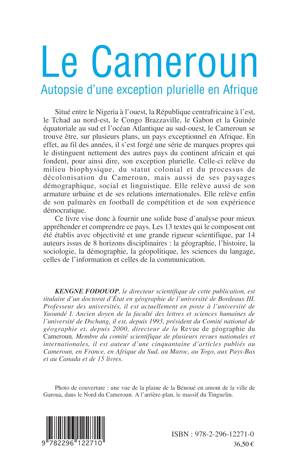 Au fil des années, le Cameroun s'est forgé une série de marques propres qui le distinguent nettement des autres pays du continent africain, fondant son exception plurielle. Celle-ci relève du milieu biophysique, du statut colonial et du processus de décolonisation du Cameroun, mais aussi de ses paysages démographique, social et linguistique. Elle relève aussi de son armature urbaine et de ses relations internationales. Au travers de ces treize contributions, voici une solide base d'analyse pour mieux appréhender et comprendre ce pays.
