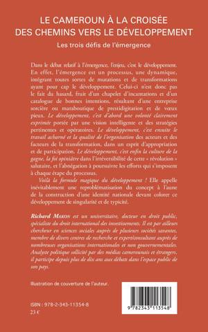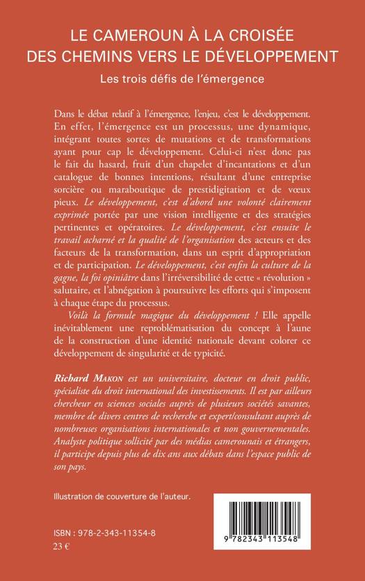 Dans le débat relatif à l'émergence, l'enjeu, c'est le développement. En effet, l'émergence est un processus, une dynamique, intégrant toutes sortes de mutations et de transformations ayant pour cap le développement. Convaincu de la pertinence du courant de pensée qui suggère une conception africaine du développement et de la modernité, l'auteur invoque dans ce contexte mouvementé trois préalables majeurs à l'émergence du Cameroun, qui sont pour lui autant de défis à relever afin de parvenir au développement de son pays: il s'agit du défi identitaire, du défi éducatif et du défi démocratique.