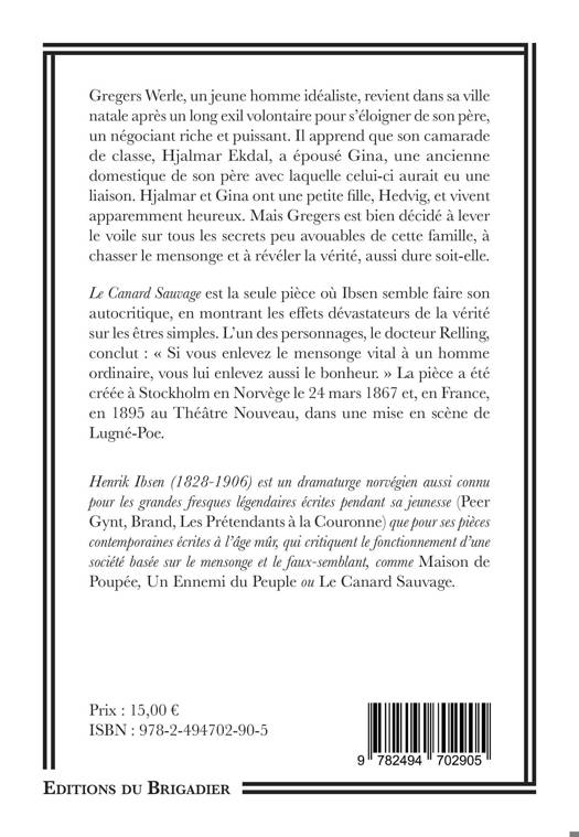 Le Canard Sauvage est la seule pièce où Ibsen semble faire son autocritique, en montrant les effets dévastateurs de la vérité sur les êtres simples. L'un des personnages, le docteur Relling, conclut : « Si vous enlevez le mensonge vital à un homme ordinaire, vous lui enlevez aussi le bonheur. » La pièce a été créée à Stockholm en Norvège le 24 mars 1867 et, en France en 1895 au Théâtre Nouveau, dans une mise en scène de Lugné-Poe.