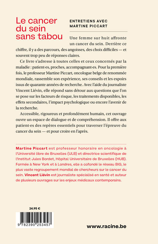 Pour la première fois, le professeur Martine Piccart, oncologue belge de renommée mondiale, rassemble son expérience, ses conseils et les espoirs issus de quarante années de recherche. Avec l'aide du journaliste Vincent Liévin, elle répond sans détour aux questions que l'on se pose sur les facteurs de risque, les traitements disponibles, les effets secondaires, l'impact psychologique ou encore l'avenir de la recherche.