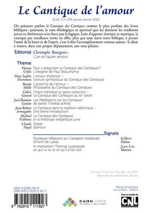 Texte parfois présenté comme le plus profane des livres bibliques, texte matriciel d´un très grand nombre de traités spirituels et mystiques, le Cantique des Cantiques engage une double réflexion sur le conflit des interprétations d´une part, sur la dichotomie entre amour profane et amour sacré d´autre part. Le projet de ce numéro est de renverser la perspective et de lire ce texte comme celui qui nous oblige précisément non seulement à articuler la lettre et l´esprit mais aussi à penser l´unité de l´amour.