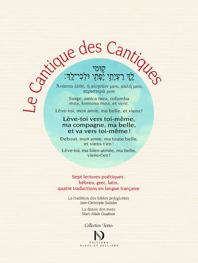 Poème d'amour sacré, le Cantique des cantiques est écrit entre le viie et le viiie siècle avant Jésus-Christ et intégré à la Bible dans les premiers siècles de notre ère. Nous le présentons dans une édition polyglotte en hébreu, grec et latin enrichie par quatre traductions françaises : celles de la Bible de Jérusalem, de la Bible Segond, de la Bible du Rabbinat et de la Bible de Chouraqui.