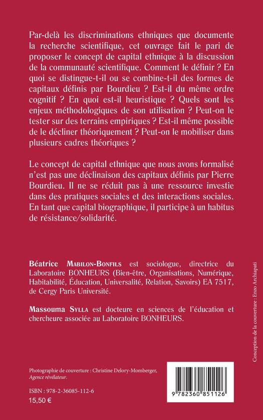 Par-delà les discriminations ethniques que documente la recherche scientifique, cet ouvrage fait le pari de proposer le concept de capital ethnique à la discussion de la communauté scientifique. Comment le définir ? En quoi se distingue-t-il ou se combine-t-il des formes de capitaux définis par Bourdieu ? En quoi est-il heuristique ? Peut-on le tester sur des terrains empiriques ? Est-il même possible de le décliner théoriquement ? Peut-on le mobiliser dans plusieurs cadres théoriques ? Le concept de capital ethnique que nous avons formalisé n’est pas une déclinaison des capitaux définis par Pierre Bourdieu. Il ne se réduit pas à une ressource investie dans des pratiques sociales et des interactions sociales. En tant que capital biographique, il participe à un habitus de résistance/solidarité.