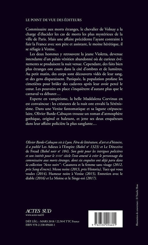 Commissaire aux morts étranges, le chevalier de Volnay a la charge d'élucider les cas de morts les plus mystérieux de la ville de Paris. Mais une affaire précédente l'ayant contraint à fuir la France avec son père et assistant, le moine hérétique, il se réfugie à Venise. Les deux hommes y retrouvent la jeune Violetta, devenue intendante d'un palais vénitien abandonné où de curieux événements se produisent la nuit venue. Cependant, des faits bien plus étranges ont cours dans la cité d'ombres et de lumières. Au petit matin, des corps sont découverts vidés de leur sang, et des gens disparaissent. Paniquée, la population profane les cimetières pour brûler des cadavres après leur avoir percé le coeur. Les pouvoirs en place s'inquiètent d'autant plus que le carnaval va débuter... Experte en vampirisme, la belle Maddalena Corvinus en est convaincue : les créatures de la nuit ont envahi la Sérénissime. Dans une Venise fantomatique et sa lagune crépusculaire, Olivier Barde-Cabuçon trousse un roman d'atmosphère gothique, original et haletant, et jette ses deux enquêteurs dans leur affaire policière la plus sanglante...