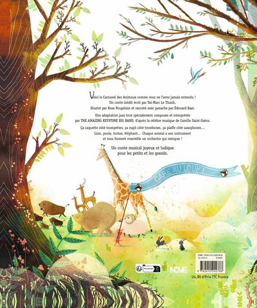 Une histoire originale et pleine d’humour lue avec panache par Édouard Baer. Tous les morceaux du Carnaval des Animaux de Camille Saint-Saëns réorchestrés en jazz, et joués par un big band plein d’énergie et de talent. Ça caquette côté trompettes, ça rugit côté trombones, ça piaffe côté saxophones… Un conte musical joyeux et ludique pour les petits et les grands.