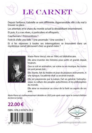 Depuis l’enfance, Gabrielle se sent différente. Hypersensible, elle a du mal à trouver sa place. Les attentats et le chaos du monde actuel la déstabilisent énormément. Et puis, il y a ses rêves, si particuliers et effrayants. Cauchemars ? Prémonitions ? Font-ils d’elle une folle ? Une anormale ? Une sorcière ? Et si les réponses à toutes ses interrogations se trouvaient dans un mystérieux carnet découvert chez sa grand-mère ?