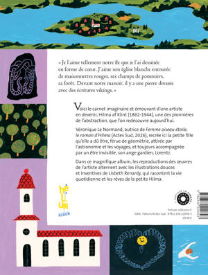 Le carnet imaginaire d'une artiste en devenir, Hilma Af Klint, peintre suédoise pionnière de l'art abstrait, à l'occasion d'une rétrospective au Grand Palais (du 6 mai au 30 août 2026). Le récit à la première personne de la petite artiste côtoie les reproductions de ses futurs tableaux les plus célèbres. Des illustrations réalisées par Lisbeth Renardy, racontant la vie quotidienne et les rêves de la petite fille, alternent avec ses oeuvres. Née en 1862 à Stockholm, Hilma grandit à la campagne, bercée par la mythologie nordique, les récits de son père commandant de marine et cartographe, et la passion de sa mère pour la botanique. Très vite, Hilma goûte aussi aux joies de la géométrie et s'éprend des couleurs...