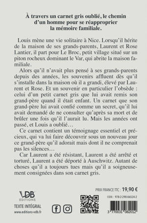 Alors qu’il n’avait plus pensé à ses grands-parents depuis des années, les souvenirs affluent dès qu’il s’installe dans la maison où il a grandi, élevé par Laurent et Rose. Et un souvenir en particulier l’obsède : celui d’un petit carnet gris que lui avait remis son grand-père quand il était enfant. Un carnet que son grand-père lui avait confié comme un secret, qu’il lui avait demandé de ne consulter qu’après sa mort et de brûler une fois qu’il l’aurait lu. Mais les années ont passé, et Louis a oublié…