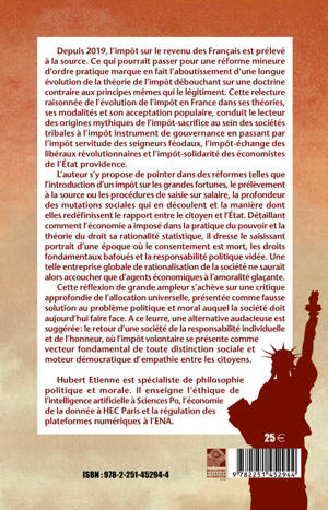 Depuis 2019, l'impot sur le revenu des Francais est preleve a la source. Ce qui pourrait passer pour une reforme mineure d'ordre pratique marque en fait l'aboutissement d'une longue evolution de la theorie de l'impot debouchant sur une doctrine contraire aux principes memes qui le legitiment. Cette relecture raisonnee de l'evolution de l'impot en France dans ses theories, ses modalites et son acceptation populaire, conduit le lecteur des origines mythiques de l'impot-sacrifice au sein des societes tribales a l'impot instrument de gouvernance en passant par l'impot servitude des seigneurs feodaux, l'impot-echange des liberaux revolutionnaires et l'impot-solidarite des economistes de l'Etat providence. L'auteur s'y propose de pointer dans des reformes telles que l'introduction d'un impot sur les grandes fortunes, le prelevement a la source ou les procedures de saisie sur salaire, la profondeur des mutations sociales qui en decoulent et la maniere dont elles redefinissent le rapport entre le citoyen et l'Etat. Detaillant comment l'economie a impose dans la pratique du pouvoir et la theorie du droit sa rationalite statistique, il dresse le saisissant portrait d'une epoque ou le consentement est mort, les droits fondamentaux bafoues et la responsabilite politique videe. Une telle entreprise globale de rationalisation de la societe ne saurait alors accoucher que d'agents economiques a l'amoralite glacante. Cette reflexion de grande ampleur s'acheve sur une critique approfondie de l'allocation universelle, presentee comme fausse solution au probleme politique et moral auquel la societe doit aujourd'hui faire face. A ce leurre, une alternative audacieuse est suggeree: le retour d'une societe de la responsabilite individuelle et de l'honneur, ou l'impot volontaire se presente comme vecteur fondamental de toute distinction sociale et moteur democratique d'empathie entre les citoyens.